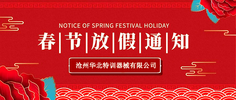 尊敬的新老客戶: 歲序更替,華章日新。華北特訓全體員工在此深深感謝大家長期以來對我司的支持與厚愛!向大家致以最誠摯的問候和最美好的祝福! 結合我司的實際狀況,公司春節(jié)放假時間具體安排如下: 春節(jié)放假時間:2022年01月24日——2022年02月07日(農(nóng)歷正月初七)。2月08日(...