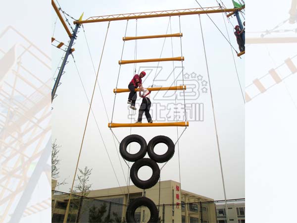 上一篇為大家分享了:拓展訓(xùn)練器材之相互依存介紹及意義,下面由華北特訓(xùn)攀巖墻廠家的小編為您分享:拓展訓(xùn)練器材之網(wǎng)繩蕩木橋的介紹及意義。 網(wǎng)繩蕩木橋也叫空中蕩木橋。該項目常規(guī)寬5.7米,高12米屬于高空拓展訓(xùn)練器材之一。該項目由主保護(hù)人員檢查保護(hù)系統(tǒng),確認(rèn)沒有問題后,參訓(xùn)人員開始從立柱開始攀爬至蕩木橋一端,從一...