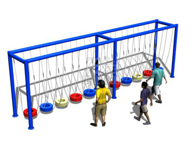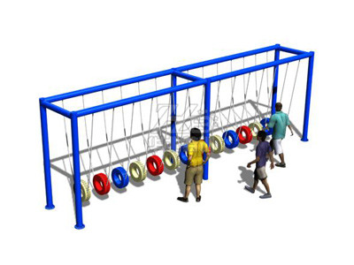 人員從吊樁一端手抓鏈條,腳踩吊樁,利用慣性通過倒換吊樁逐一通過,到達(dá)終點(diǎn)。