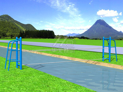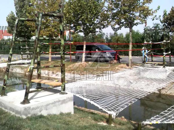 通過(guò)時(shí)雙手抓緊身體兩側(cè)的鋼絲繩,腳下踩一條鋼絲繩通過(guò),慢慢的到達(dá)終點(diǎn)。