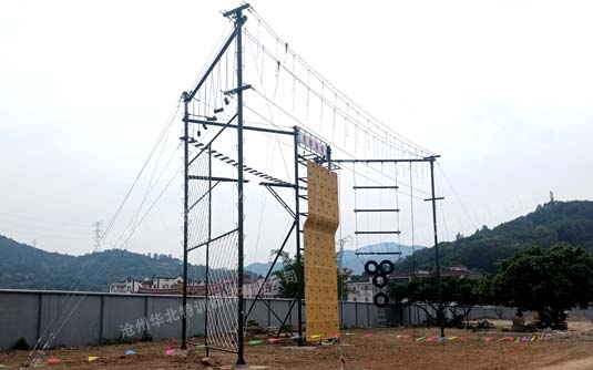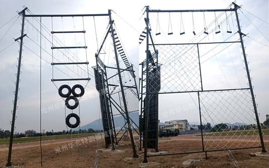 該基地建設(shè)的高空A04-M1是根據(jù)部隊(duì)訓(xùn)練大綱要求定制的標(biāo)準(zhǔn)M型高空訓(xùn)練組合器械。器械規(guī)格:37.17米×19.04米×12米(高),最小場地需求40米×22米,主要材料:立柱φ159×6鋼管、橫梁φ159×5鋼管,橫梁與立柱使用U形抱箍連接。主要項(xiàng)目:空中單杠、斷橋、蕩木橋、繩網(wǎng)、云梯、吊索橋、空中索道、攀巖墻、平行鋼繩