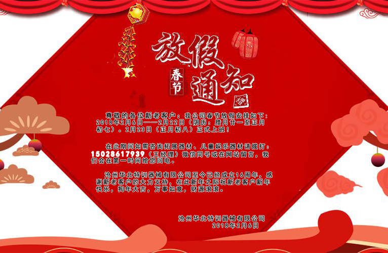 滄州華北特訓器械有限公司至今已經(jīng)成立16周年,感謝新老客戶的大力支持,在此新年之際祝新老客戶新年快樂,狗年大吉,萬事如意,財源滾滾。 ...
