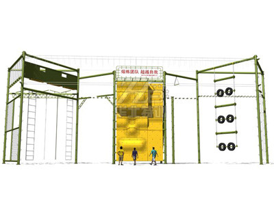 器械整體占地45.7米×9.86米×12米(高),最小場(chǎng)地需求49.34米×11米。 主要項(xiàng)目:攀巖、單杠、斷橋、天梯、蕩木橋、繩網(wǎng)、吊索橋、相互依存、叢林繩