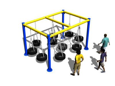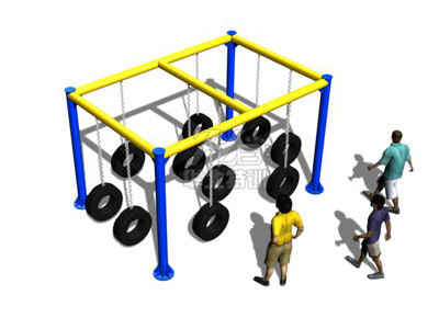 參訓(xùn)人員腳踩輪胎,手借助吊繩,通過(guò)慣性移動(dòng)到另一個(gè)輪胎上,到達(dá)終點(diǎn)。