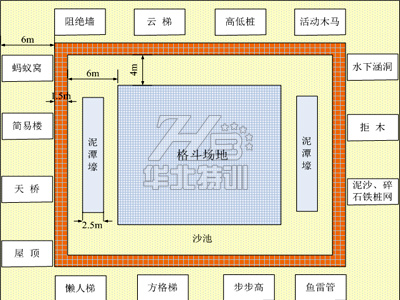 主要設(shè)置長方形訓(xùn)練場坪、環(huán)形過道和泥潭(石子)鐵樁網(wǎng)、魚雷管、步步高、方格梯、懶人梯、屋頂、天橋、簡易樓、螞蟻窩、阻絕墻、云梯、高低樁、活動木馬、水下涵洞、拒木、泥潭壕等16組障礙,以及相應(yīng)安全防護(hù)設(shè)施。